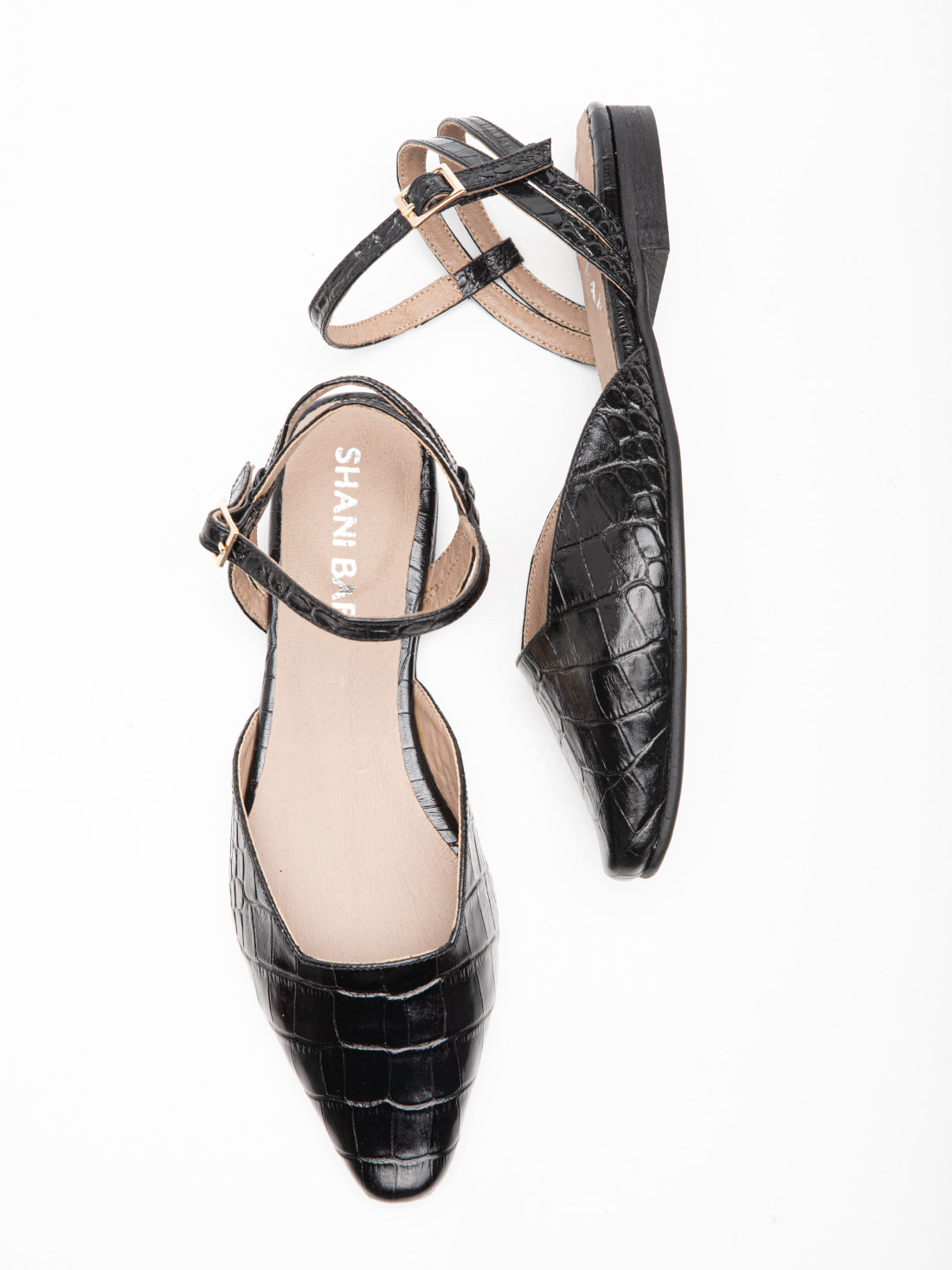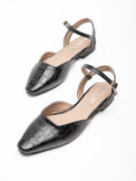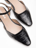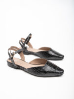 שטוחה, מחודדת, עם עור קרוקו שחור מבריק שיש בו אופי אמיתי. רצועת קרסול דקה עם אבזם זהב עדין – פרט אחד קטן שמשנה את כל התמונה. הגזרה המחודדת מאריכה את הרגל, הקרוקו המבריק מוסיף טקסטורה בלי לצעוק, והשטוח הוא לא ויתור – הוא בחירה.