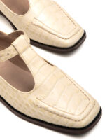 קו רטרו מעודן עם גזרה מחמיאה. הרצועה המרכזית מסגרת את כף הרגל בצורה רכה, הבוהן המרובעת מוסיפה נוכחות עדכנית, והסגירה הצדדית נותנת התאמה אישית מדויקת. שחור חלק וקלאסי, או בז' בטקסטורת קרוקו עדינה שמוסיפה עניין בלי להיות צועק. שניהם עובדים בקלילות עם כל דבר בארון.