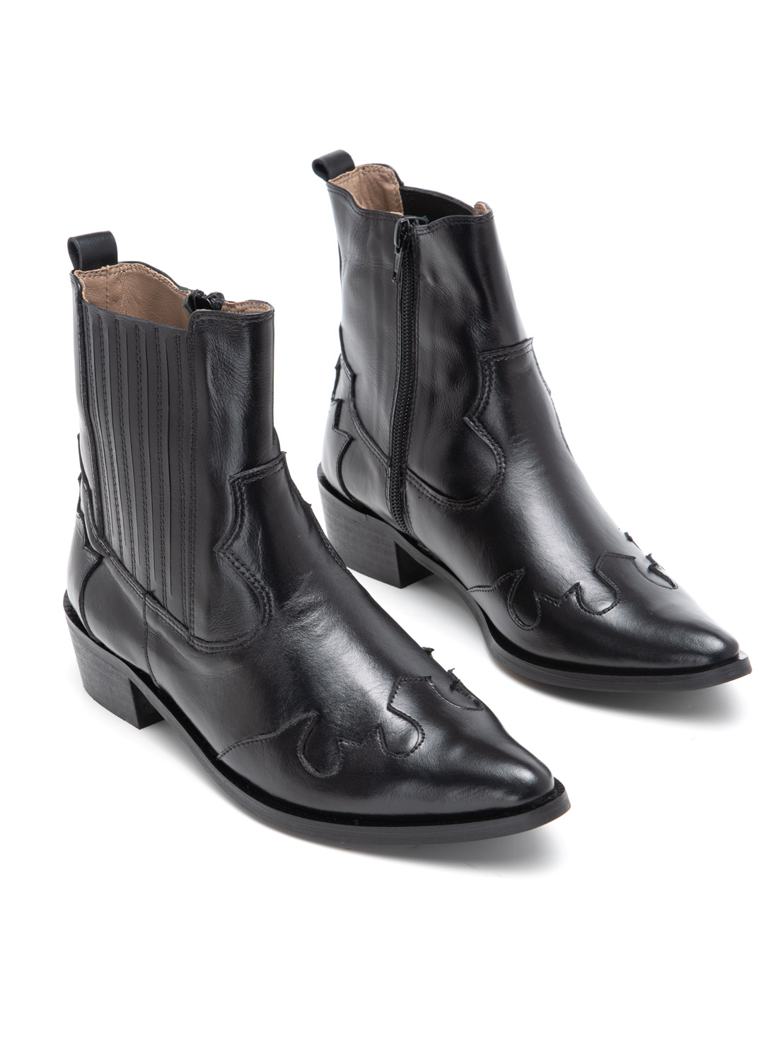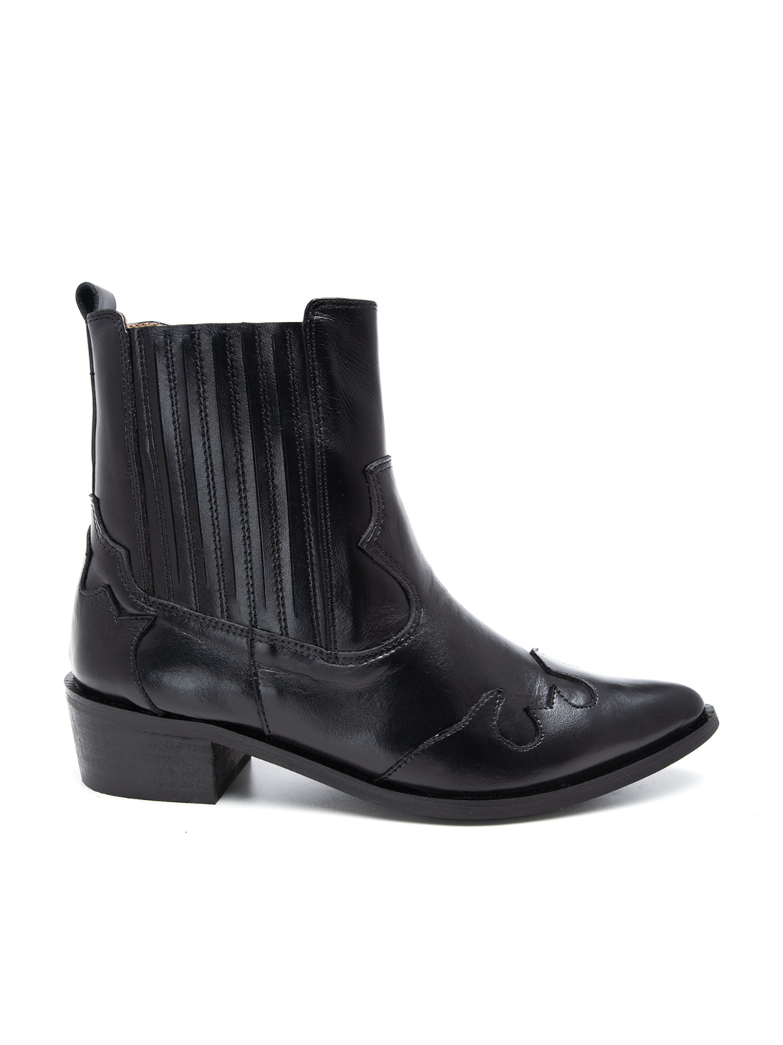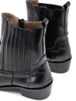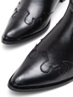 שחור עם עיטורי ווסטרן מובלטים, גומי אלסטי לנעילה מהירה, קצה מחודד שלא מתפשר, ועקב שנותן לך את הגובה בלי להתנצל על זה. זה המגף שמביא איתו אנרגיה – גם אם את סתם הולכת לקנות חלב.