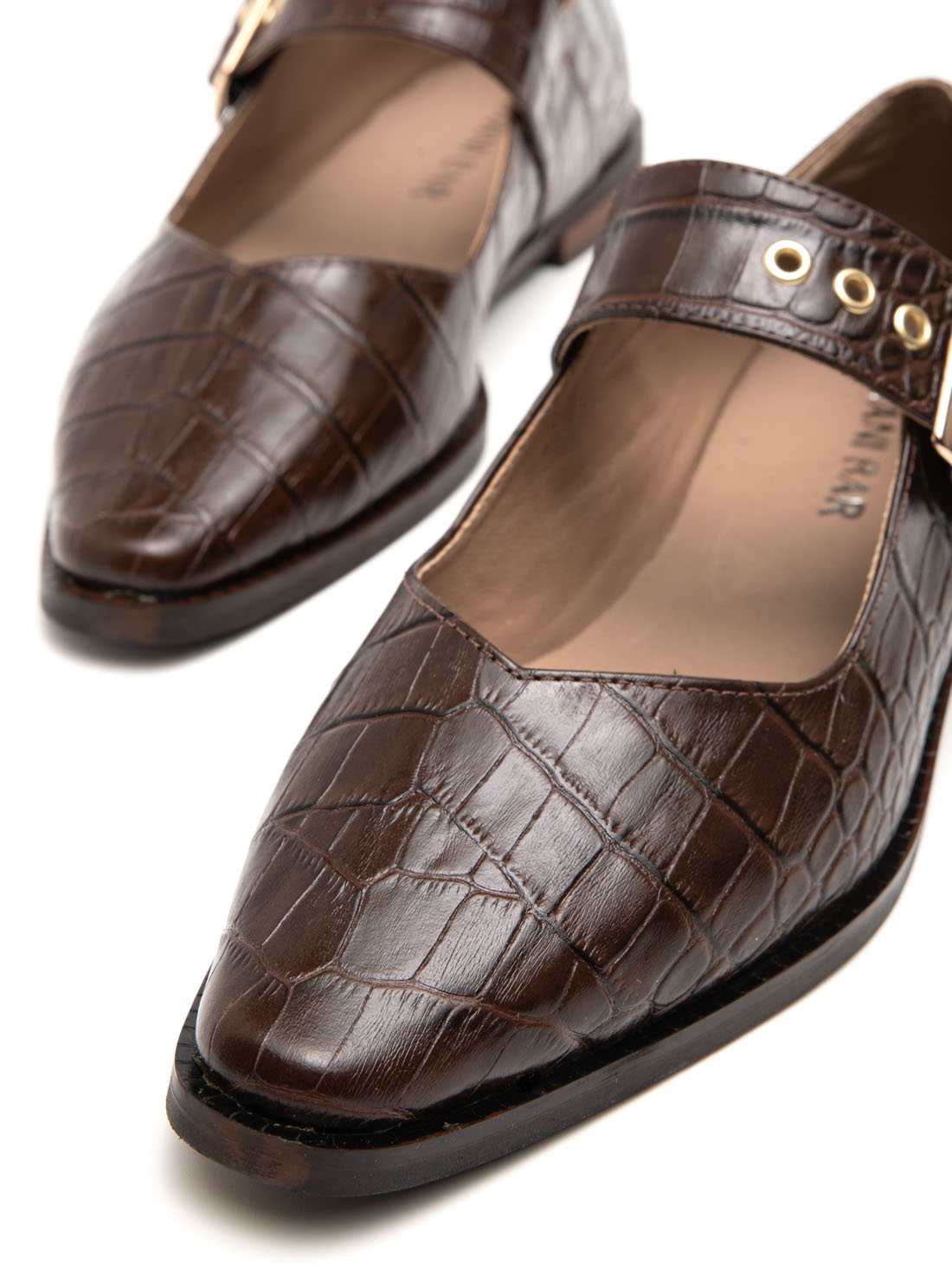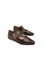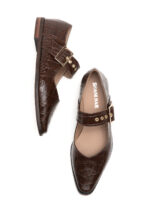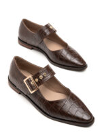 האבזם המרכזי הוא הכוכב – גדול מספיק כדי להיות הצהרה, אבל לא מוגזם. הרצועה הרחבה יוצרת איזון חזותי מושלם עם הבוהן המרובעת, והתפירה המוקפדת סביב הקצוות נותנת תחושת עבודת יד מדויקת. בשחור חלק ואלגנטי, הנעל נראית מינימליסטית אבל לא קרה. בחום עם טקסטורת קרוקו, היא מקבלת עומק ואופי שמוסיף חום לכל מראה.