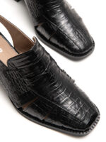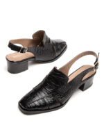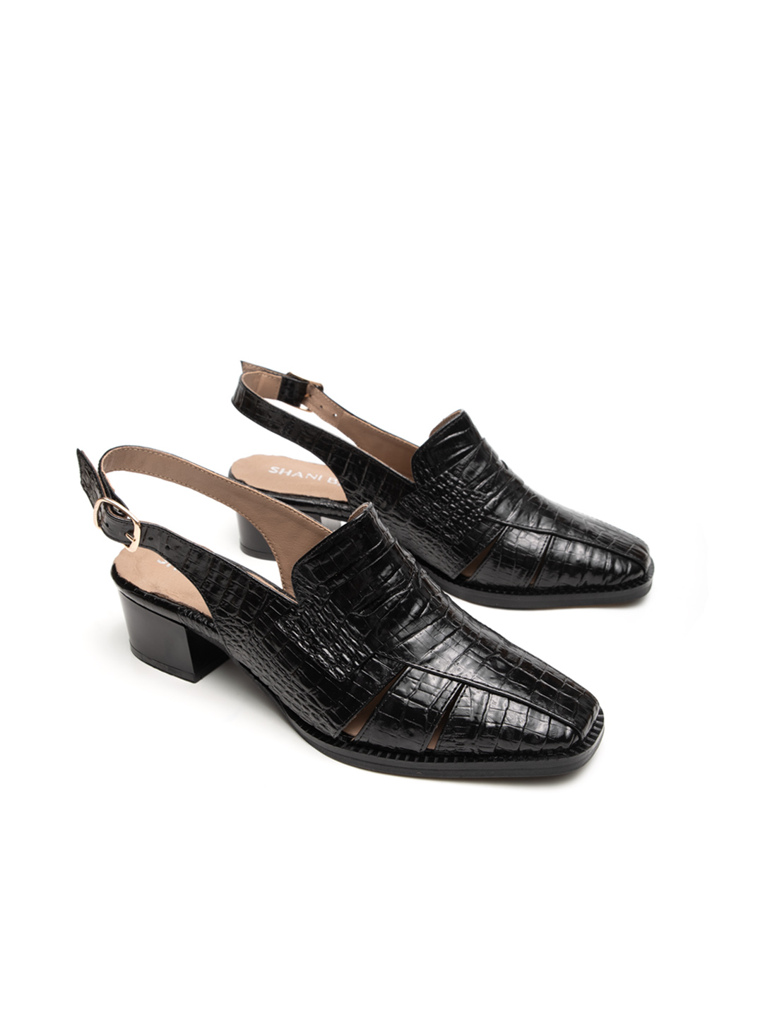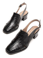 עור קרוקו איכותי בגימור מלא טקסטורה – אלגנטי, מעודן, עם אופי. השחור חד ומודרני, החום חם ועשיר. שני הגוונים מתחברים לכל דבר בארון, אבל עם נוכחות משלהם. רצועת העקב המתכווננת מבטיחה התאמה אישית מדויקת, והקו הנקי של הבוהן מחמיא לכף הרגל ומאריך את הרגל בצורה טבעית.