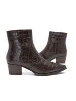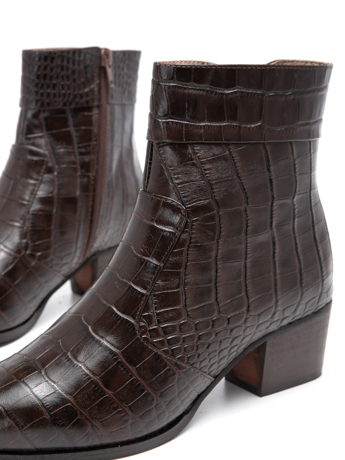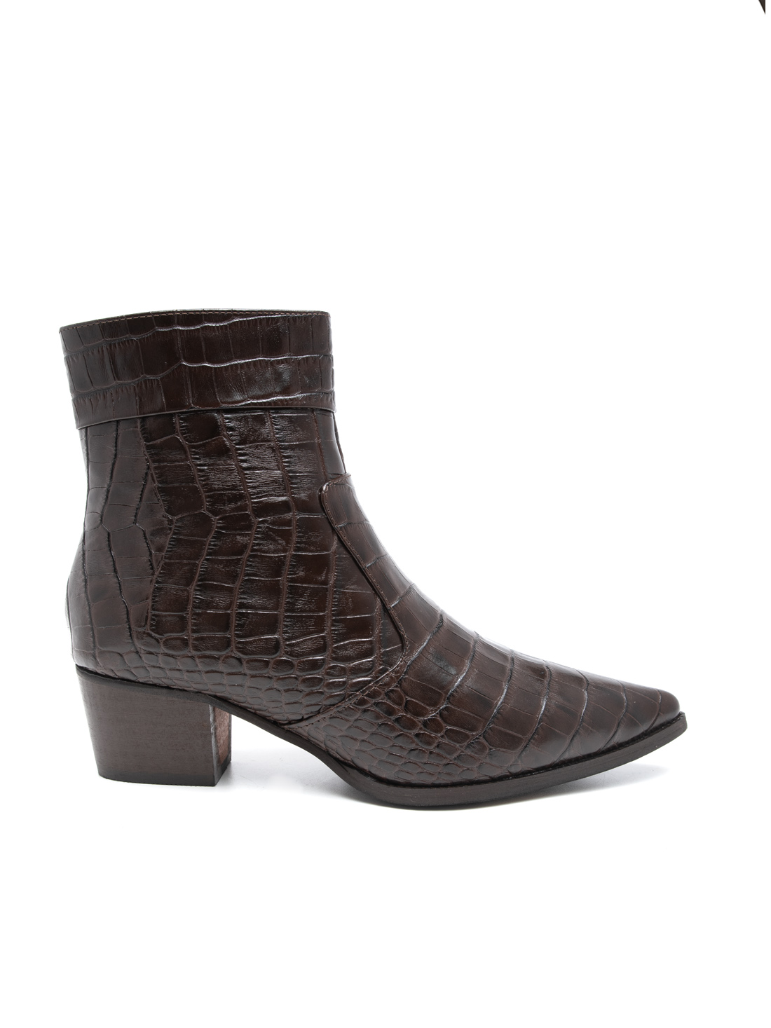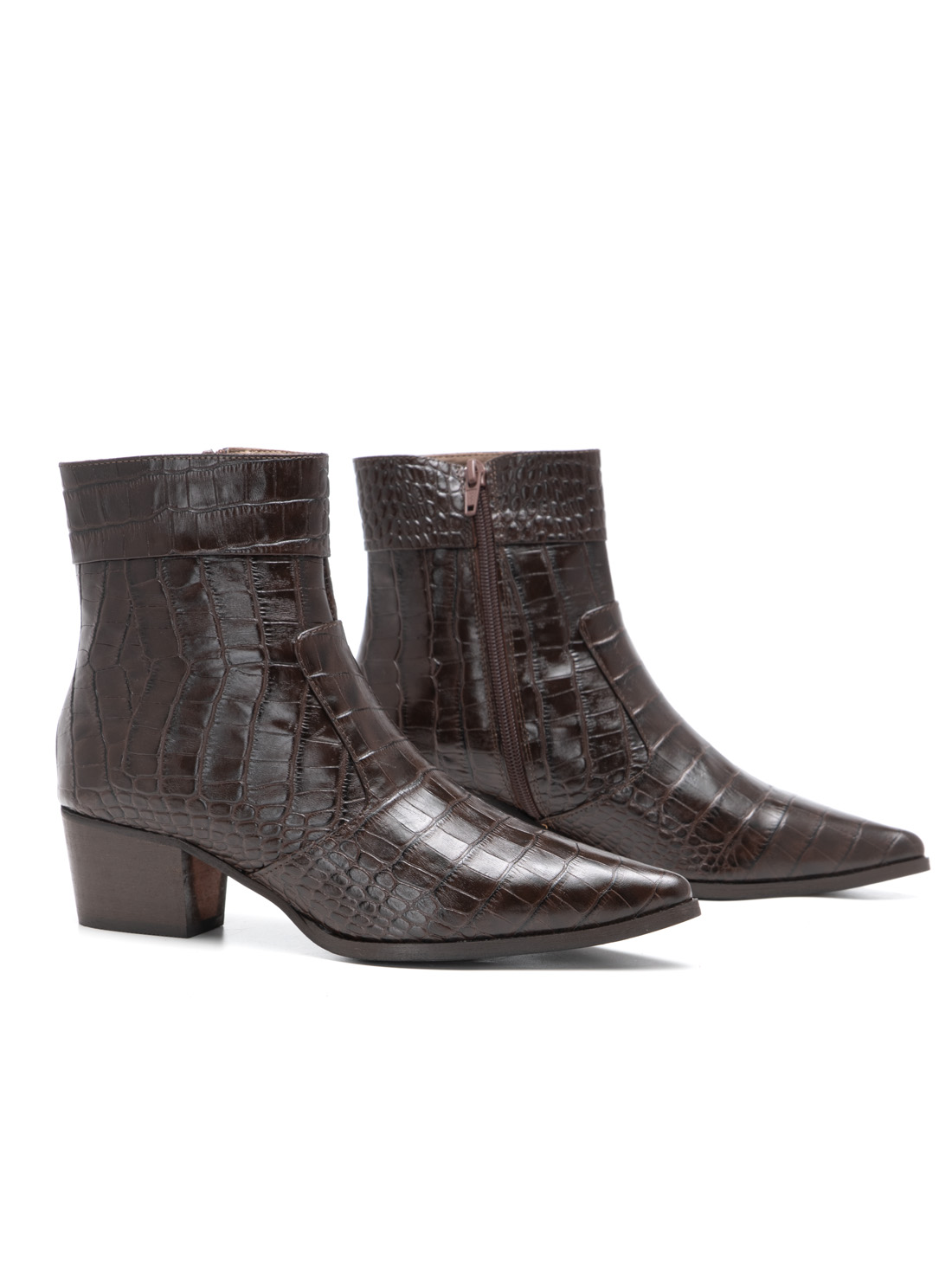מגף קרסול בגוון חום עשיר עם טקסטורת קרוקו מובלטת, קצה מחודד שמעודן את הרגל, ועקב בגובה 5.5 ס״מ שנותן את הגובה הנכון – לא גבוה מדי, לא שטוח מדי. בול.