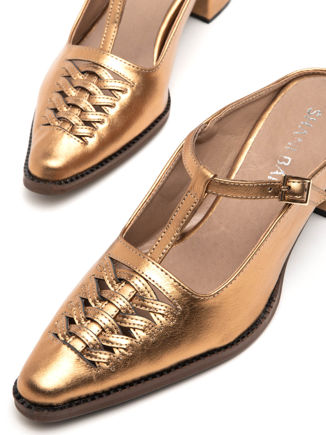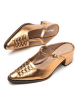 קו נקי עם נגיעה אומנותית. הרצועה המרכזית יוצרת מסגרת חכמה לכף הרגל, והפרט הקלוע בחזית מוסיף תנועה ועניין בלי להיות צועק. העקב בגובה מושלם – מספיק כדי להאריך את הרגל, אבל עדיין יציב ונוח למהלך של יום שלם. שלושה גוונים שכל אחד מהם מספר סיפור אחר: שחור קלאסי ומתוחכם, קוניאק חם ואדמתי, וזהב מטאלי שמוסיף ברק בלי להיות מוגזם.