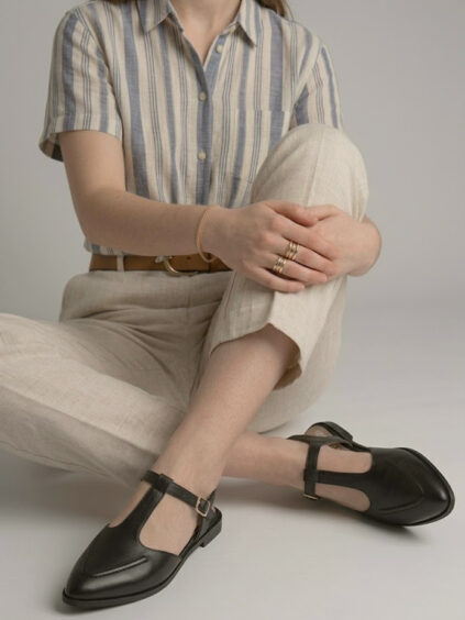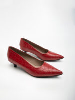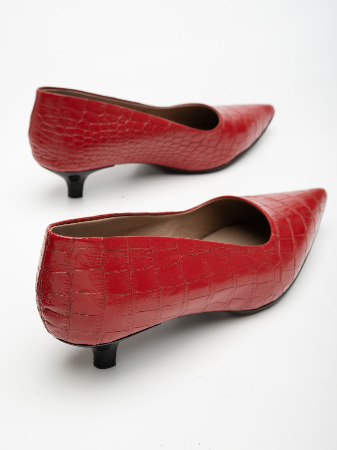 פרלה היא השני. עקב קיטן של 4 ס"מ שנותן גובה בלי לבקש ממך להתאמץ, קו מחודד שמארך את הצעד, ומרקם קרוקו עדין שהופך כל לוק למשהו יותר מעניין.