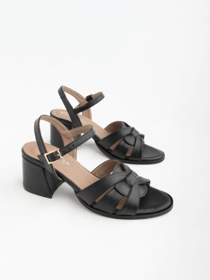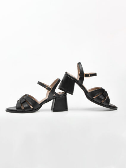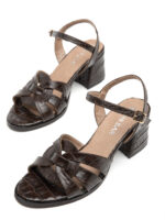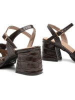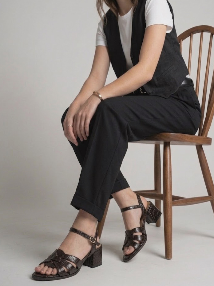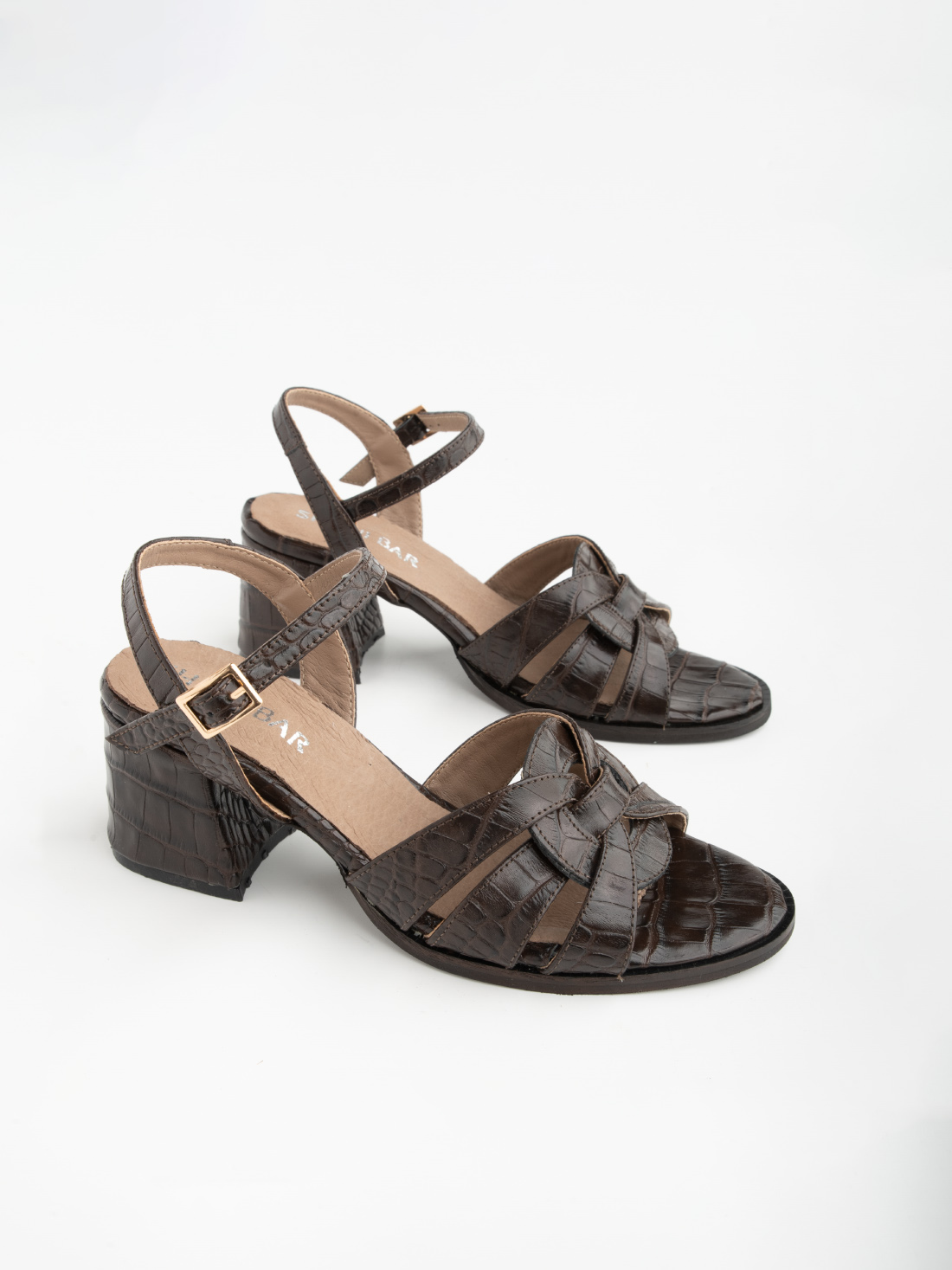 רצועות עור קרוקו חום עמוק שנשזרות על כף הרגל בצורה שהיא גם אחיזה וגם תכשיט, עקב בלוק של 6 ס"מ שמרים ומאריך את הרגל בלי לעייף, ואבזם זהב קטן על רצועת הקרסול שסוגר את הלוק בדיוק הנכון. הפנים עטוף עור בז' שמלווה את כף הרגל לאורך יום שלם.