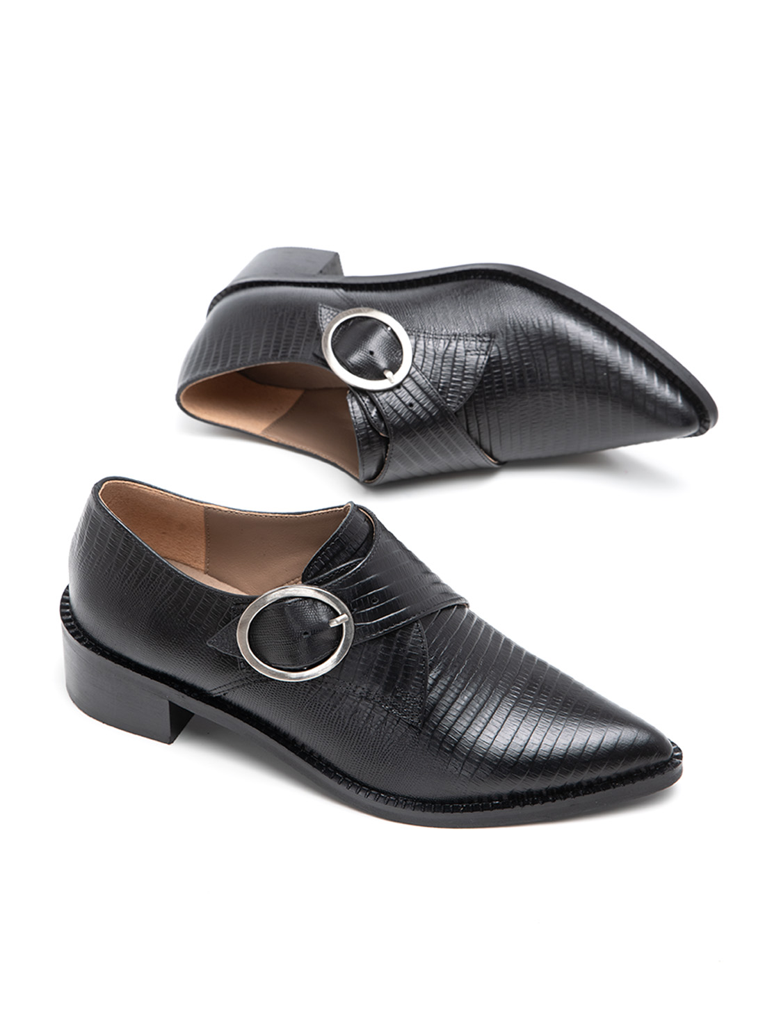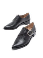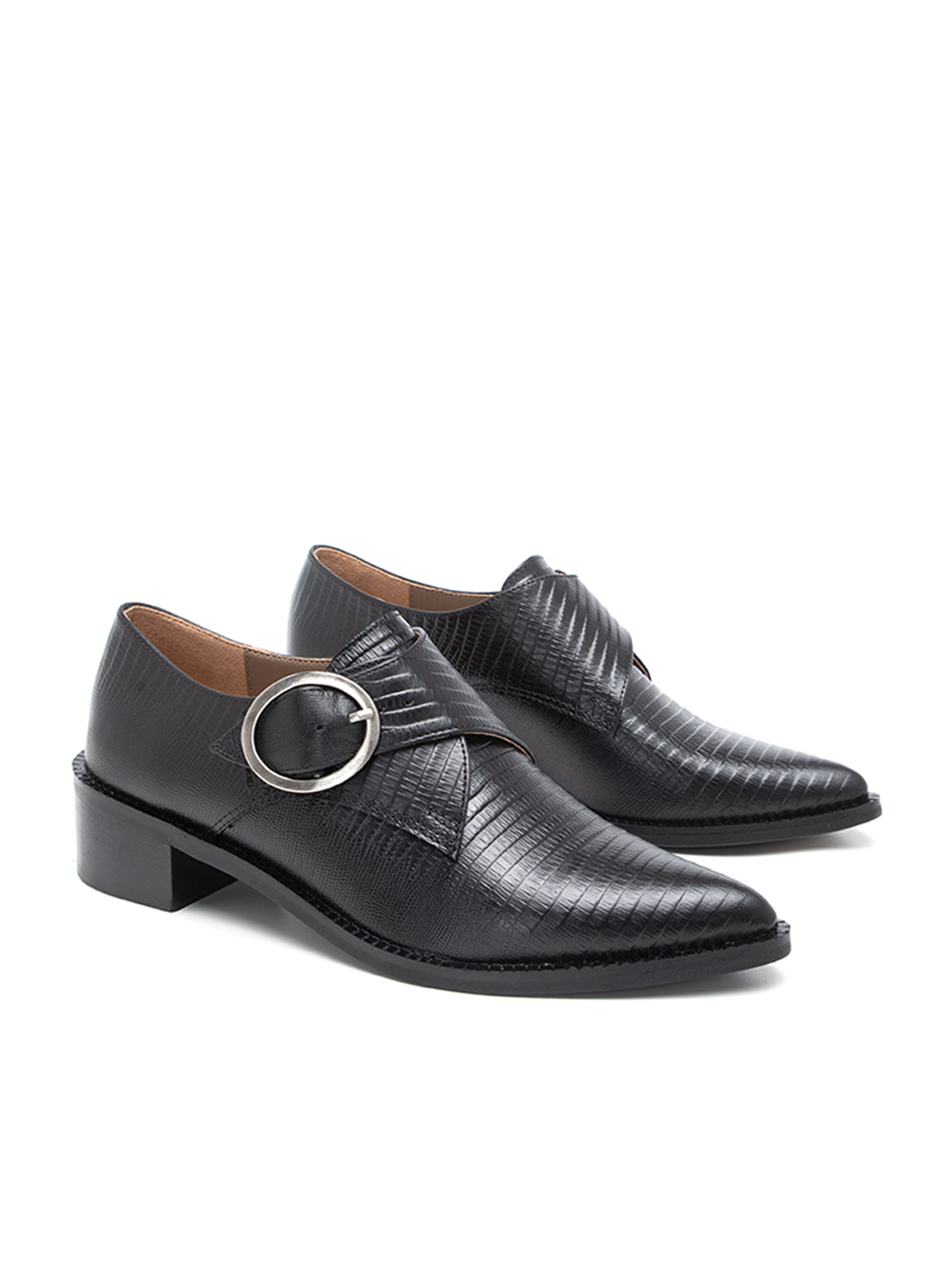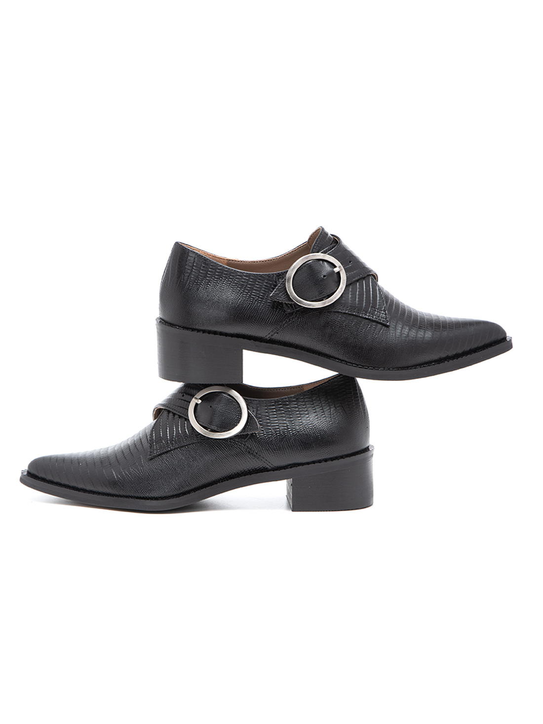במבט ראשון היא נראית כמו אוקספורד מחויטת ומסודרת – הקו הגברי העדין, העקב הנמוך והיציב. אבל אז מופיע האבזם העגול הזה בצד, ופתאום יש כאן משהו אחר לגמרי. משהו שקורץ, שלא מתנצל, שאומר "אני לא רק עוד נעל עבודה".